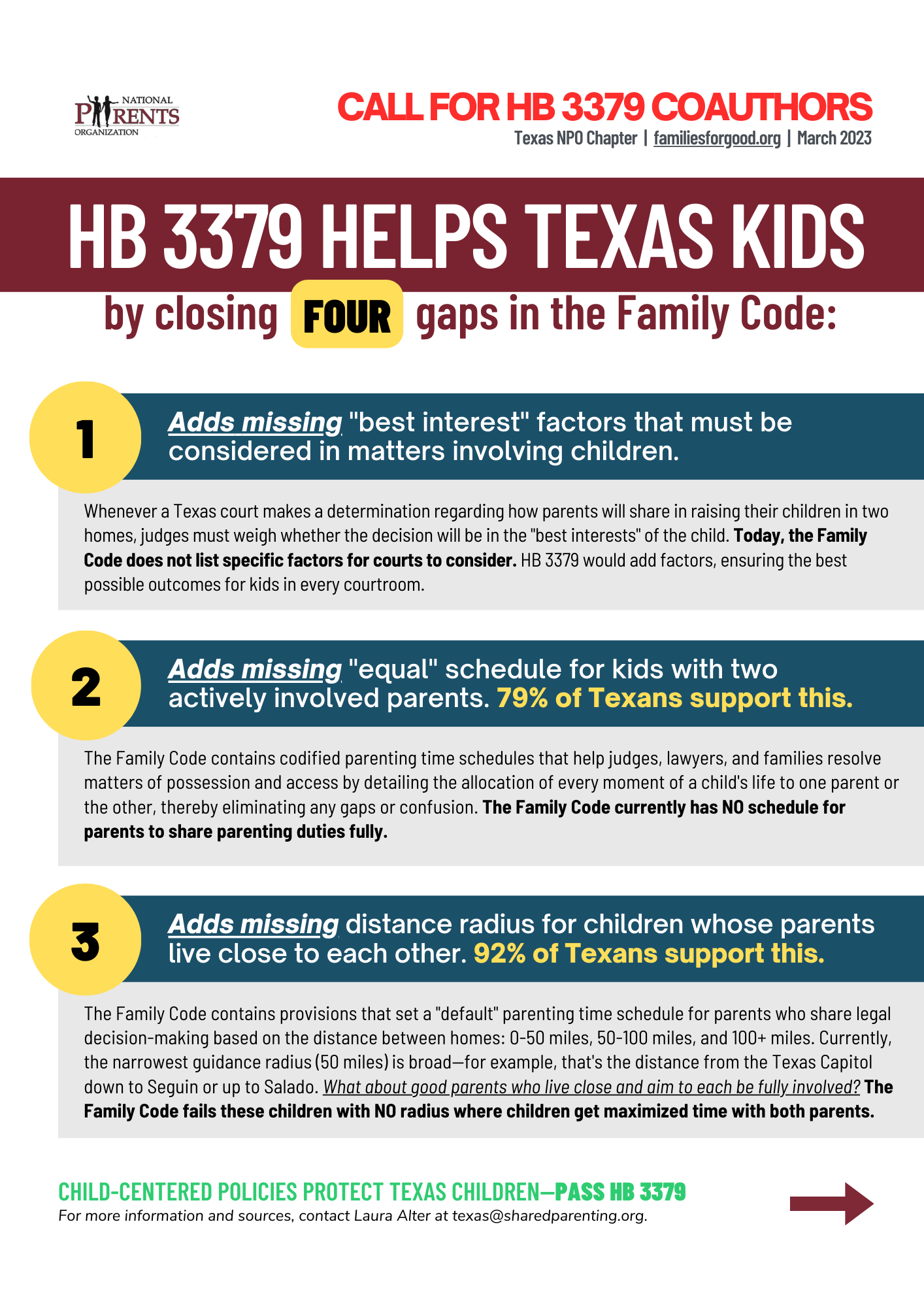 In HB 3379, Representative Cook proposes a new distance radius that has a default of an “equal” parenting time schedule for parents who share legal custody (Joint Managing Conservators), giving children maximized access to both of their parents. This builds on the existing parenting time schedules in the Family Code that are based on distance between parents. Currently, the Family Code does not include an “equal” schedule option for Texas parents, and this bill would close that gap.