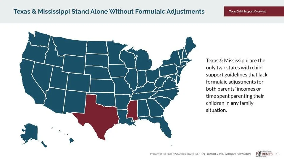 Texas has the unique distinction of being one of only TWO remaining states with child support guidelines that lack formulaic adjustments for both parents’ incomes or time spent parenting their children in any family situation.