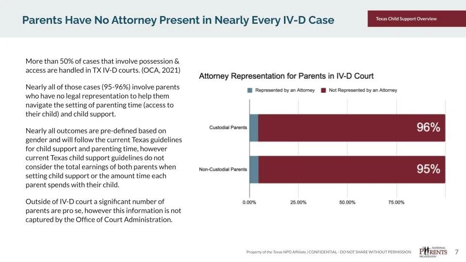 The concerning reality is that nearly ALL parents in Texas IV-D courts, which resolve over 50% of cases involving child support and parenting time, do NOT have any legal representation, according to the OAG.
